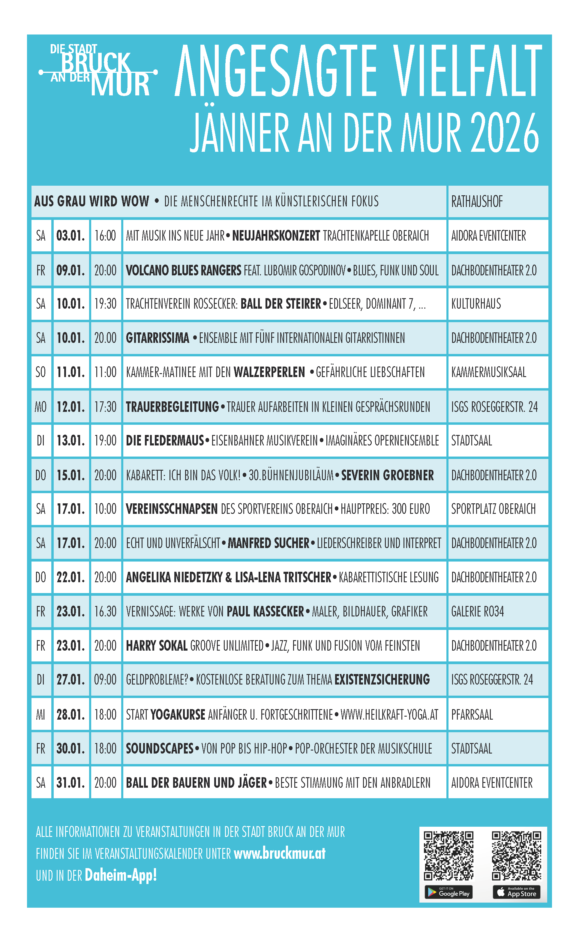 Mit einem abwechslungsreichen Kultur- und Eventprogramm begrüßt die Stadt Bruck das neue Jahr 2026. Der Kalender bietet einen Überblick über aktuelle Veranstaltungen und lädt dazu ein, ausgewählte Termine besonders im Blick zu behalten.
