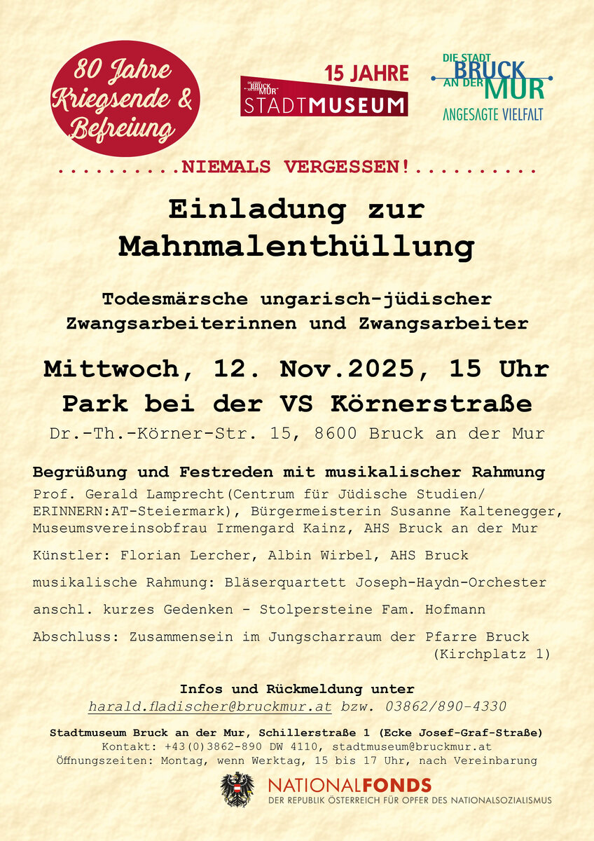 Am 12. November 2025 wurde im Park neben der Volksschule Körnerstraße in Bruck an der Mur ein neues Mahnmal für die Todesmärsche ungarisch-jüdischer Zwangsarbeiterinnen und Zwangsarbeiter enthüllt. Das Mahnmal ist ein Gemeinschaftskunstwerk von AHS-Absolventinnen und Absolventen mit den Künstlern Florian Lercher und Albin Wirbel in Kooperation mit dem Stadtmuseum Bruck.