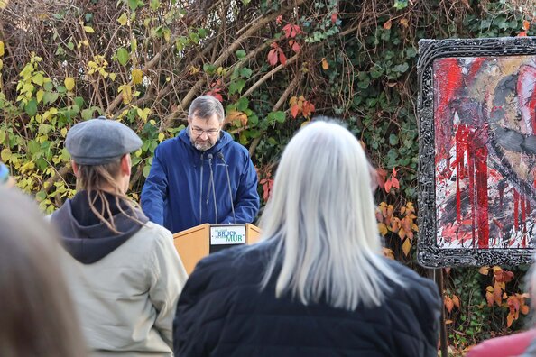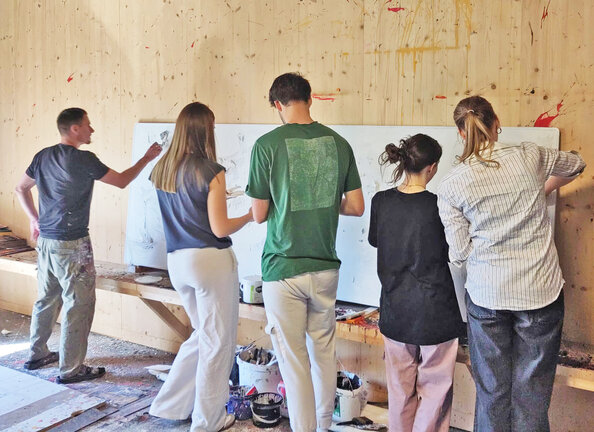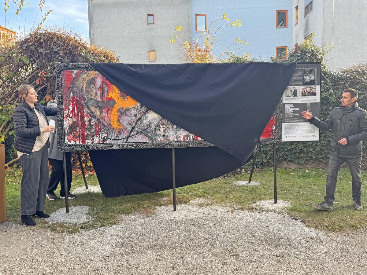 Schülerinnen und Schüler, mittlerweile Absolventinnen und Absolventen des Brucker Gymnasiums, hatten sich im Laufe ihres letzten Schuljahres im Rahmen eines Generationenprojektes und im Unterricht intensiv mit der Thematik auseinandergesetzt. Neben einem gemeinsamen Mauthausenbesuch konnten sie sich bei Vorträgen der Historiker:innen Eleonore Lappin-Eppel, Gerald Lamprecht und Heimo Halbrainer bestens informieren. Zum Abschluss ihrer Schulkarriere legten die Jugendlichen bei einem Workshop mit dem Brucker Künstler Florian Lercher und Professorin Birgit Remele mit einem großflächigen abstrakten Bild den künstlerischen Grundstein für ein Mahnmal, das Florian Lercher gemeinsam mit dem Metallkünstler Albin Wirbel finalisierte.